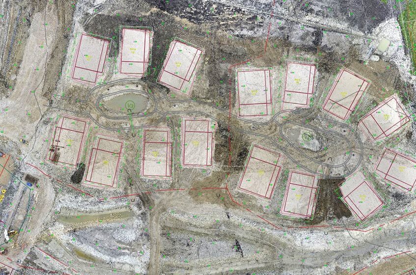 Opmålingerne anvendes til kvalitetssikring og kontrol af placeringer af bærelagene til husene og til beregning af volumener af jorddeponier på byggepladsen.